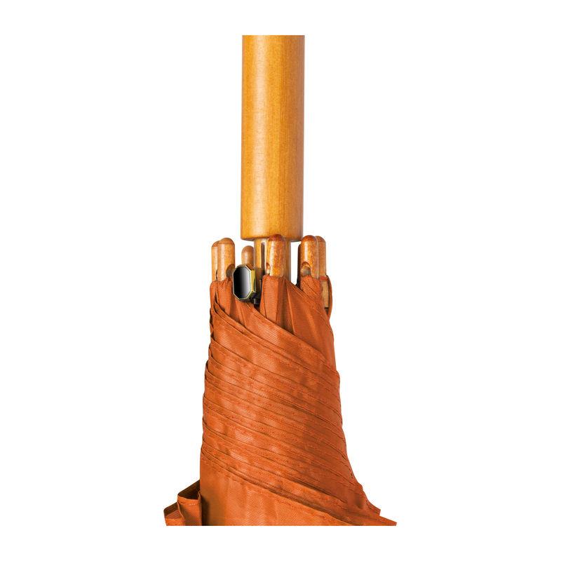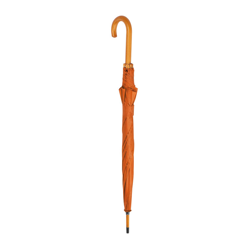 Umbrelă automată cu tijă şi mâner curbat din lemn.