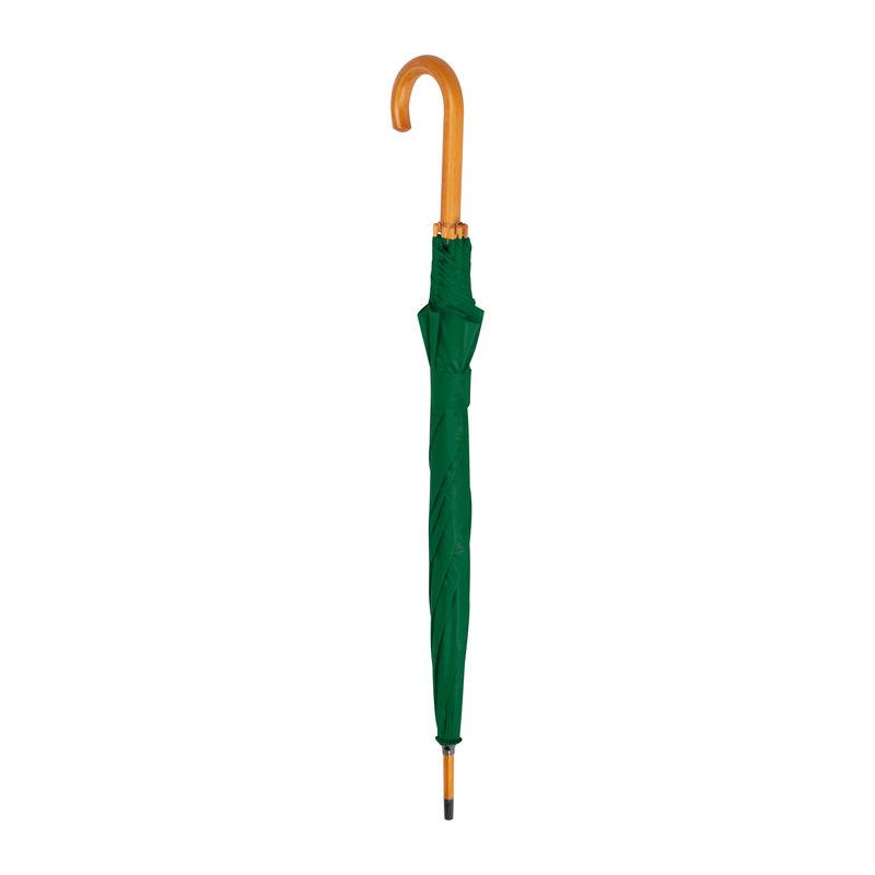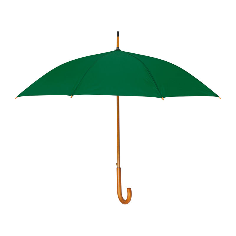 Umbrelă automată cu tijă şi mâner curbat din lemn.