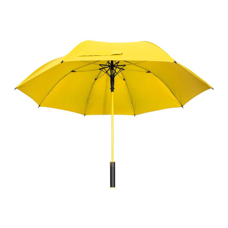 Umbrelă clasică cu mâner inelar integrat, deschidere automată, cadru și spițe din fibră de sticlă. Pânza este din material 190T pongee.