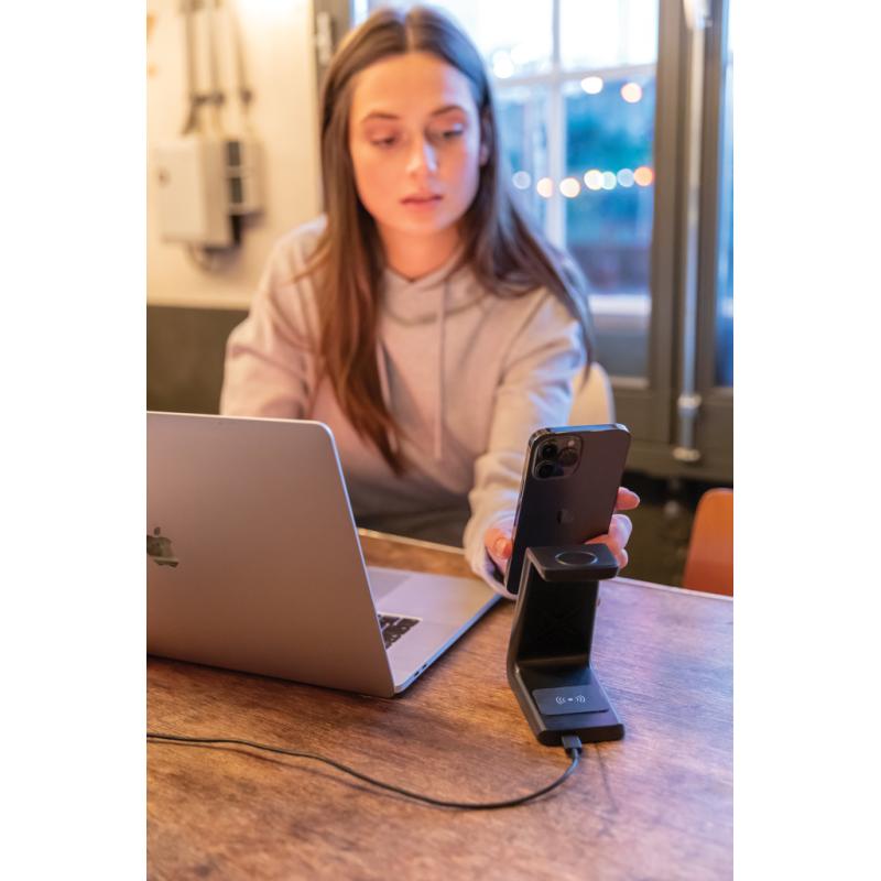 15W 3 in 1 wireless charging stand made with RCS (Recycled Claim Standard) certified recycled ABS. Total recycled content: 60% based on total item weight. RCS certification ensures a completely certified supply chain of the recycled materials. This wireless charger, charges your phone in the fastest way possible. The charger comes equipped with a dual coil 15W wireless charger, 5W wireless charger at the back and on top a 3W iWatch charger. Including 120 cm type C charging cable made from RCS certified recycled TPE. Urban Vitamin items are made without PVC and packed in plastic reduced packaging. Input: 5V/3A, 9V/2A 5V/1A, 9V /1.1A