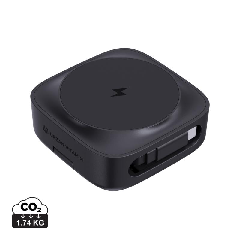 The power to charge, all in one sleek design. Urban Vitamin Goleta is a 2-in-1 15W magnetic wireless charger with a retractable 65cm USB-C cable, combining wireless charging and wired convenience in one compact, portable solution. Whether you’re charging your phone, iWatch, or both, Goleta offers the flexibility and efficiency you need. Designed with a super strong magnetic connection, Goleta securely holds your phone in place while delivering wireless charging at up to 15W for phones, with multiple output options (10W, 7.5W, 5W) depending on your device. The 2.5W wireless output for iWatch ensures your smartwatch stays powered as well. The retractable RTPE cable ensures tangle-free, easy storage while you charge, and with an input of 9V/3A USB-C, it delivers efficient power for all your devices. Goleta is made with RCS (Recycled Claim Standard) certified RABS. Urban Vitamin items are made without PVC and packed in plastic-reduced packaging.