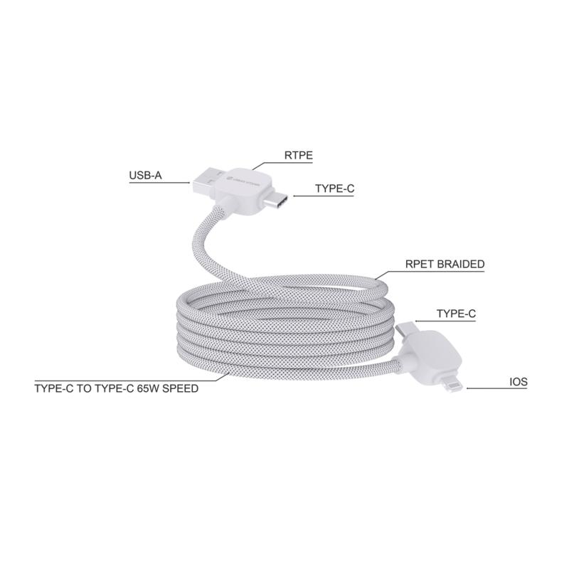 The ultimate 120cm magnetic charging cable for seamless connectivity and unmatched convenience! Say goodbye to tangled cables with Stockton, designed to revolutionise your charging experience. Its magnetic design simplifies cable managment, avoids tangled cables and is portable to bring anywhere. Stockton caters to your on-the-go lifestyle, offering both USB Type-C and USB-A inputs, ensuring compatibility with various devices. With iOS and Type-C outputs, it's versatile enough to charge your iPhone, Android device, or laptop! Stockton isn't just a charging cable; it's your go-to for seamless data transfer, syncing files, photos, and music between devices at lightning speed. With a robust 65W charging capability, it's a game-changer for mobile devices and laptops alike. Stockton is made with RCS (Recycled Claim Standard) certified recycled ABS. Total recycled content: 30% based on total item weight. Urban Vitamin items are made without PVC and packed in plastic reduced packaging