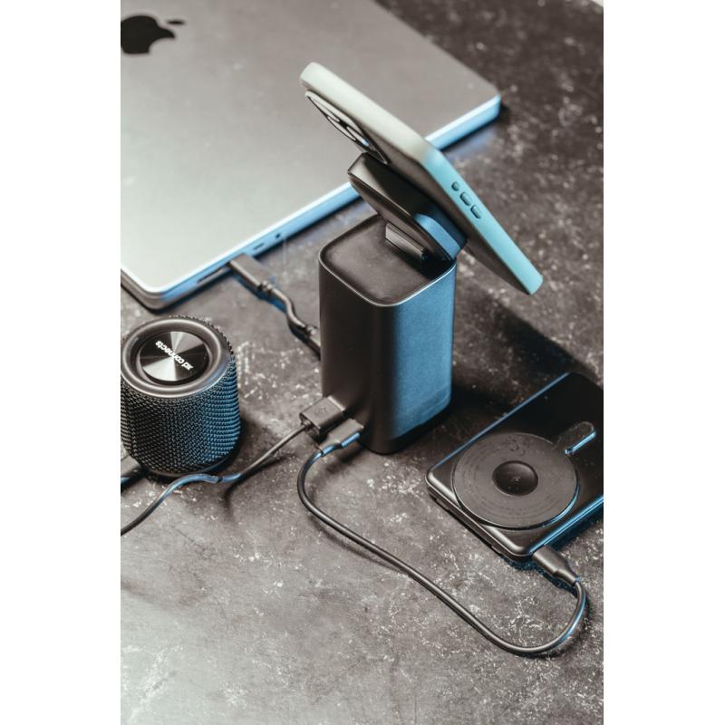 The Urban Vitamin Sunnyvale powerbank is a state-of-the-art charging solution designed to meet the demands of modern life. With a robust 15,000 mAh capacity and support for 100W ultra-fast charging, this powerbank ensures all your devices, including laptops and MacBooks, stay powered up at lightning speed. It features a high-quality TFT colour display that provides real-time updates on charging speed and other essential details for ultimate convenience. What sets the Sunnyvale apart is its integrated 15W wireless magnetic phone stand, allowing you to charge your phone wirelessly while keeping it perfectly positioned for hands-free use. With three output ports—two USB-C and one USB-A—and the wireless charging option, the Sunnyvale can charge up to four devices simultaneously, making it a versatile companion for any situation. Crafted from durable aluminium, the Sunnyvale combines a premium look and feel with a compact, portable design. PVC free.