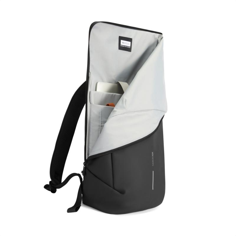 Experience versatile, all weather design and enhanced security with Urban backpack. Its unique L shaped wide opening main compartment,complete with an expandable section and ample space for a 16 inch laptop, offers effortless access to your essentials. The anti theft design, coupledwith a self locking metal zipper puller, ensures that your belongings remain safe. The addition of a rear pocket and a dedicated water bottle pocketbrings convenience to your daily adventures, making it the ideal companion for urban explorer. This backpack is not only water repellent, it's durable and stylish. Crafted with Aware ™traceable recycled polyester and finished with a soft touch PU coating, perfect for any occasion. 17% recycledcontent. Registered design®