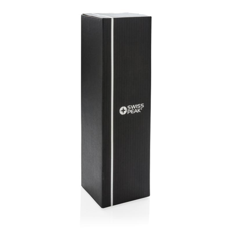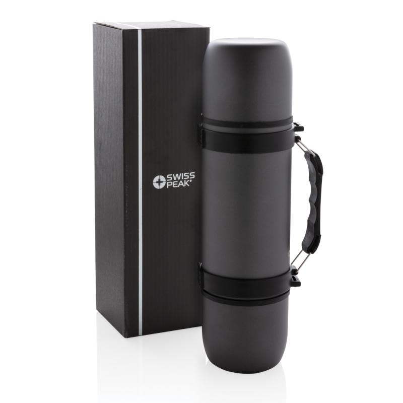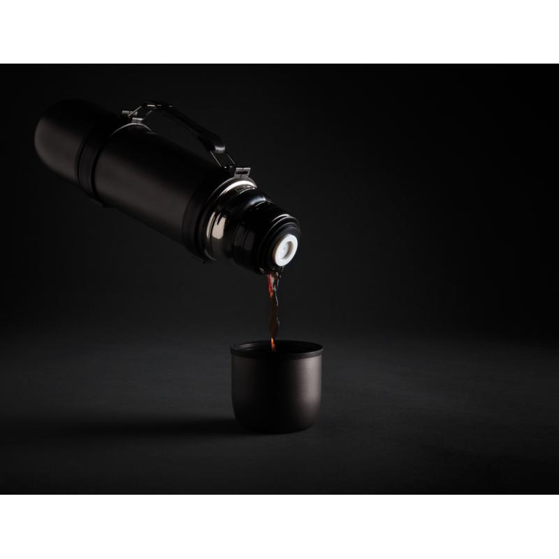 Stainless steel double wall vacuum flask in an elegant design with grip and shoulder strap and contains two matching cups for an optimal drinking experience. Leakproof and handwash only. Content 700ml.