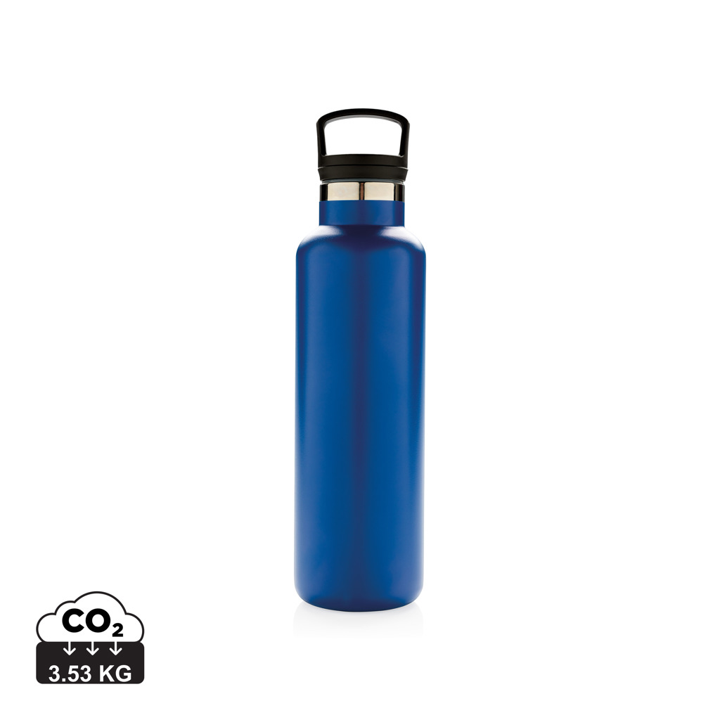 Powder coated double wall vacuum insulated bottle. 2-in-1 lid with filter, perfect for hot tea or infused water. Standard mouth opening, ideal for sipping and adding ice cubes. Built to last, great bottle for any season. 304 SS inner and 201 SS outer keeps your drinks hot for up to 5h and cold for up to 15h. Content: 600ml.