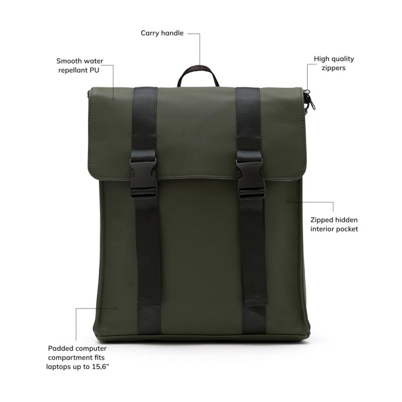 Minimalistic and clean backpack that suits all occasions. The backpack is made of PU-material and has adjustable straps for optimal comfort. The backpack is also equipped with a zipper pocket on one side and a hidden pocket on the back, so you can easily turn your back without worrying about your valuables. Works equally well as a work bag and as a school bag.Suitable for computers with an overall size of 17 inches. Please note that the dimensions of the display are not the same as the dimensions of the entire computer.