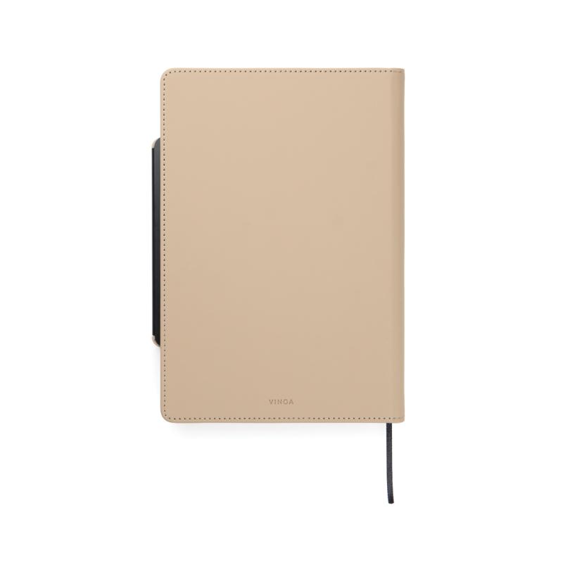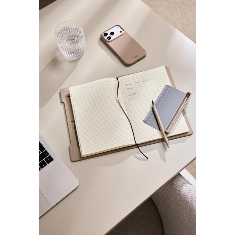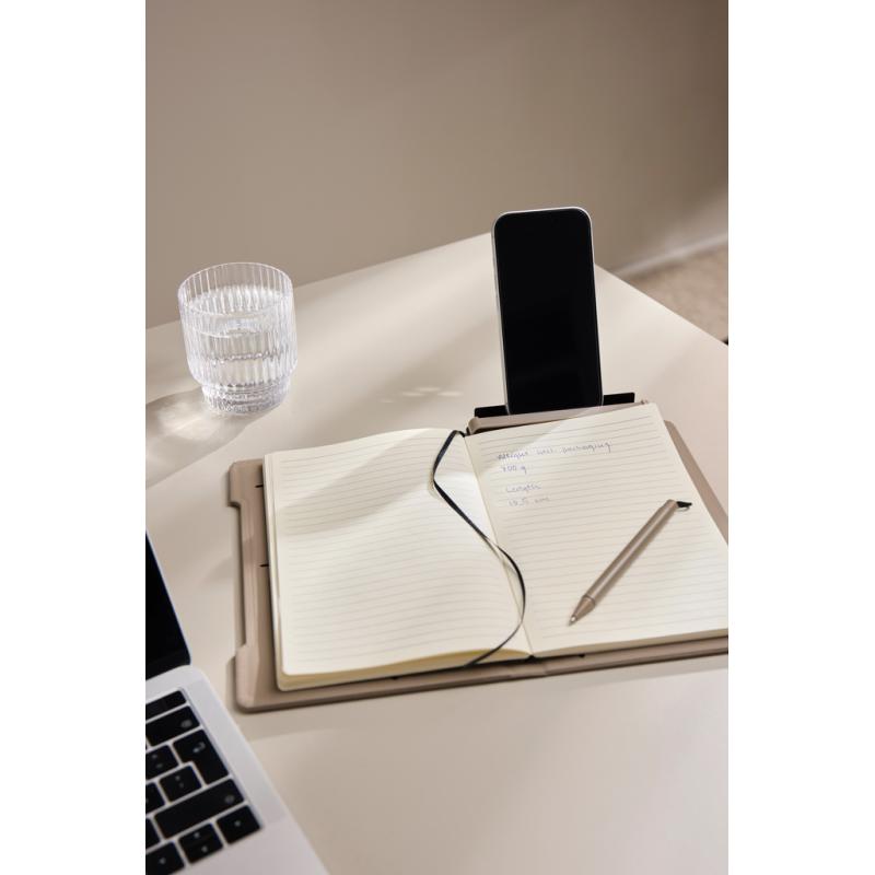 Meet the ultimate multifunctional notebook designed to support your daily workflow. This smart 4-in-1 solution combines practicality, flexibility and design in one. Crafted from RCS certified recycled paper with a cover in classic Baltimore matte PU coating making it as visually appealing as it is functional. A magnetic ruler serves as both a ruler and pen holder including a matching ballpoint pen with blue ink. The pen holder easy transforms into a phone stand integrated into the notebook’s structure. The interior features card holder flaps for convenient storage and an easily replaceable notebook insert for long-lasting use. The notebook contains 80 sheets / 160 lined pages, providing plenty of space for notes, planning, and ideas. It is the perfect companion for meetings, travel, or everyday organisation. Total recycled content: 70% based on total item weight. Certified by Control Union, CU1162221.