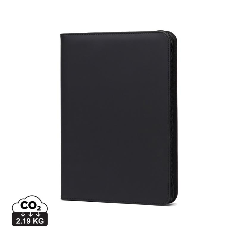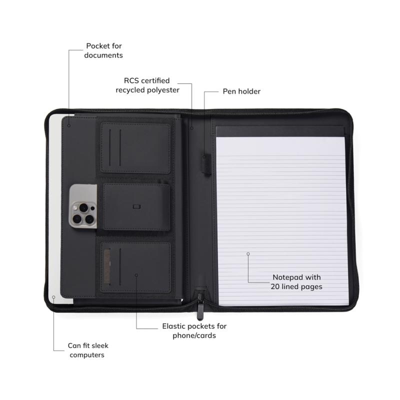 Stay organised and carry your important essentials with this sleek A4-sized portfolio. Featuring a pen holder, a pocket for paper, elastic band pockets for cards, phone, along with a notepad containing 20 lined pages. Made from partly recycled polyester, with the classic Baltimore matt PU coating, this portfolio is the ideal accessory for your desk or for taking on the go. The paper insert is replaceable, ensuring long-lasting use. Certified by RCS (Recycled Claim Standard), RCS certification guarantees that the entire supply chain of recycled materials is certified. The total recycled content is based on the overall product weight. This product contains 6% RCS certified recycled polyester.