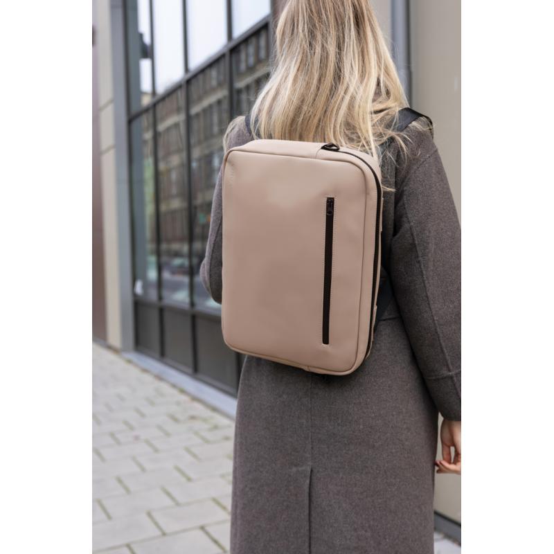 Meet your ultimate 2-in-1 companion: a convertible backpack and brief designed to support your everyday life. Use it as a sleek computer brief for business meetings and professional settings, wear it as a crossbody bag or effortlessly switch to a backpack for a hands-free efficient journey to your next destination. It offers adjustable shoulder straps, built-in handle, easy-access outside pocket, a smaller inside pocket and laptop compartment. Fits most laptops up to 15". Please note: Display dimensions may vary from laptop dimensions. Certified by RCS (Recycled Claim Standard), RCS certification guarantees that the entire supply chain of recycled materials is certified. The total recycled content is based on the overall product weight. This product contains 16% RCS certified recycled polyester.