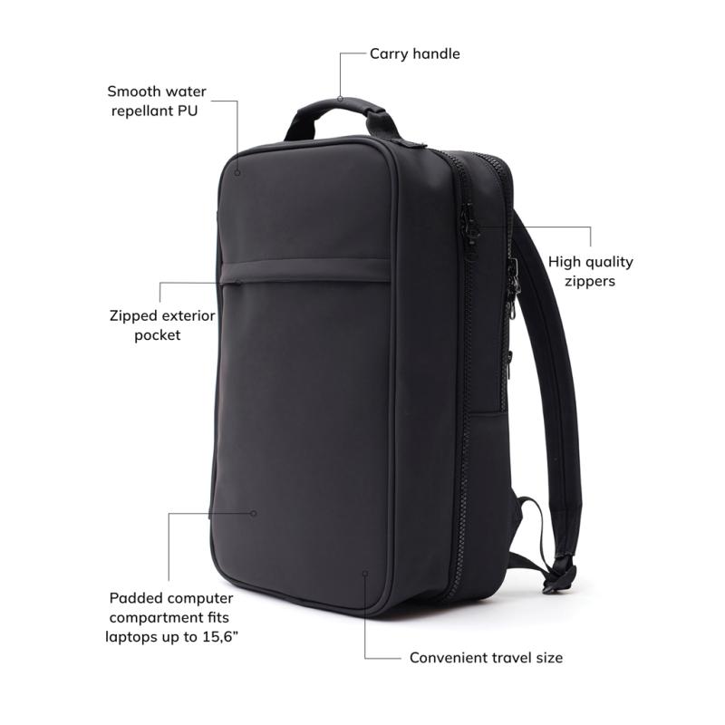 This backpack comes in a minimalistic and modern design and has handy organizational capacities, ensuring that you can fully utilize all of its space. There is a padded compartment for the computer and a hidden pocket on the back for safe storage of the valuables. The backpack's handy size, adjustable straps and well-planned compartments make it easy for you to carry everything that you need on the go. A perfect companion for short trips or nightovers. Made of PU which gives the bag its water-repellent properties.Suitable for computers with an overall size of 17 inches. Please note that the dimensions of the display are not the same as the dimensions of the entire computer.