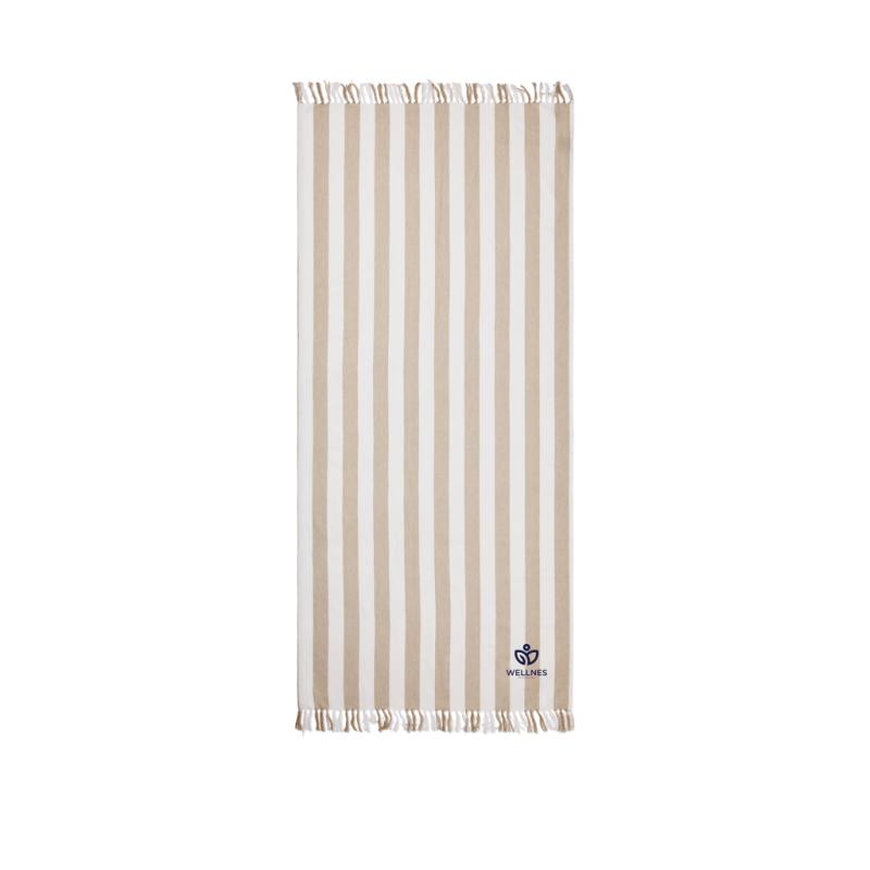 This hammam beach towel features a classic two-coloured striped pattern with fringes on the short sides. Crafted from a lightweight and airy 200 gsm blend, it combines the comfort of cotton with the quick-drying benefits of polyester. Measuring 80x180 cm, it is perfect for the beach or poolside. Certified by GRS (Global Recycled Standard), GRS certification guarantees that the entire supply chain of the recycled materials is certified. The total recycled content is based on the overall product weight. This product contains 68% GRS certified recycled cotton and 29% GRS certified recycled polyester.