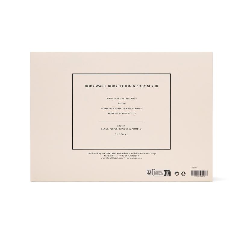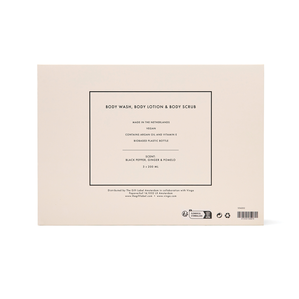 Lets turn every shower or bath into a luxurious ritual. This 3-piece unisex set includes 200 ml tubes of body wash, body scrub and body lotion, crafted to nourish your skin from head to toe. Infused with the warm, zesty aroma of black pepper, ginger and pomelo it leaves your skin feeling smooth, refreshed and subtly fragranced. Elegantly packed in a giftbox in cream white and black.