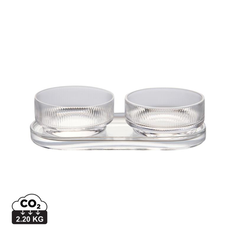 A tapas set with timeless design and classic, clean lines. Perfect for any occasion where you want to serve small dishes, snacks, or other sides with style and elegance. The set includes two bowls and a tray, which can be used together or separately. Made from soda-lime glass. The bowls hold 250 ml. Dishwasher safe.