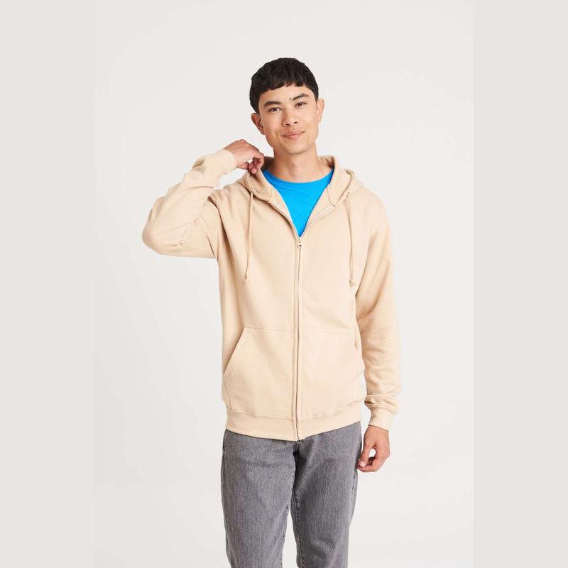 80% Ringspun Cotton/20% Polyester men's sweatshirt. Full-zip hoodie with double fabric hood. Kangaroo pockets on sides, simple tear out label. WRAP certified production. 280 g/m²